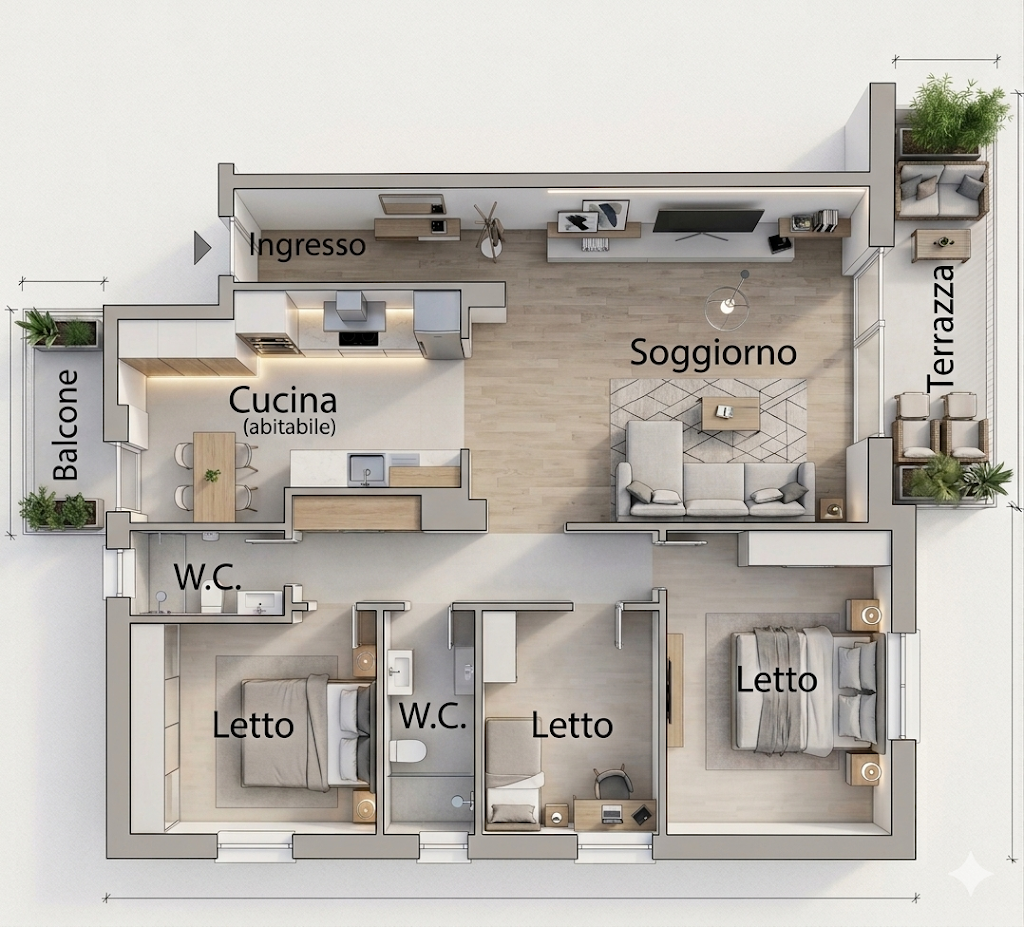 Zona giorno: accogliente ingresso, salone con terrazza abitabile e cucina abitabile di ampie dimensioni con balcone di servizio.